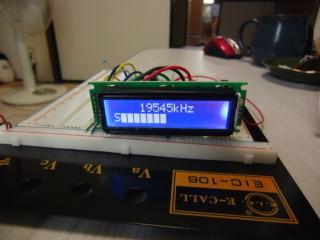 ブレッドボードで試作します。写真はマイコンのクロック周波数(20MHz)を入力したところです。