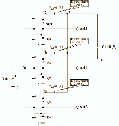 このネットリスト特性を変えた3つのインバータの入出力特性と回路への突入電流の大きさを調べるためのものです。電流計として電圧が零の電圧源を使っています。